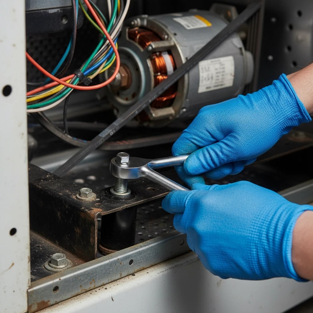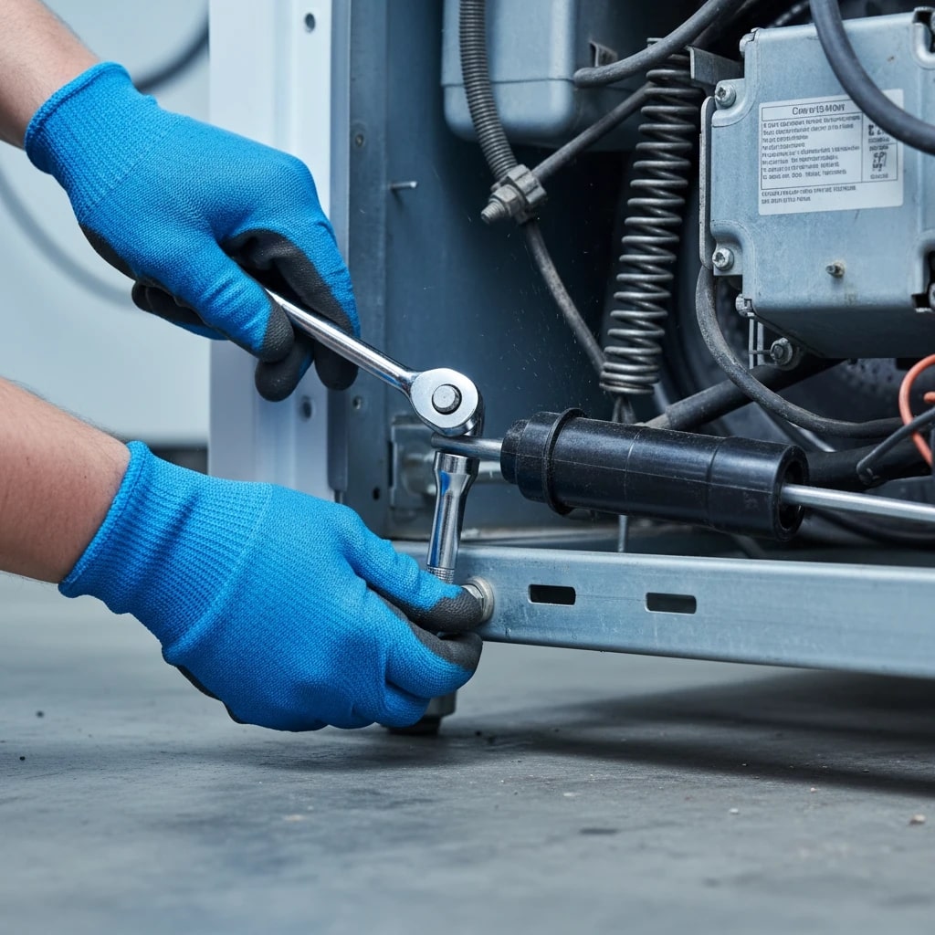 ۴. اگر لرزش ریز داشتید، پایههای زیر لباسشویی را مجدد رگلاژ کنید (این مرحله حیاتی است، چون کمکفنر نو سفت است و نیاز به تراز دقیقتر دارد).